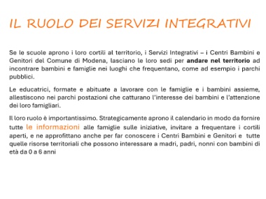Se le scuole aprono i loro cortili al territorio, i Servizi Integrativi – i Centri Bambini e